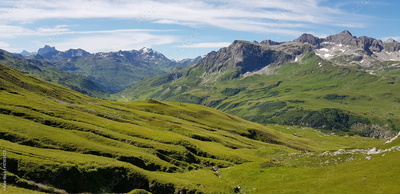 Green Mountain Slopes with Coniferous Forest and Blue Sky