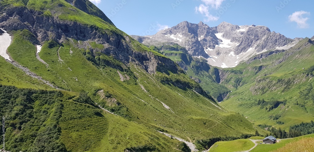 Green Mountain Slopes with Coniferous Forest and Blue Sky