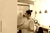 A woman stands in her kitchen opening the fridge to find something to eat during mealtime, surrounded by food items