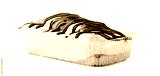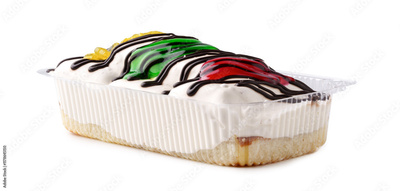Delicious frozen dessert topped with colorful icing and drizzled chocolate in a clear container