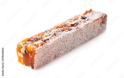 Sweet dessert bar made with nuts and fruits on a white background, showcasing a blend of textures and colors