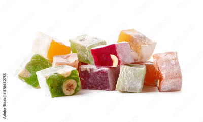 Colorful assortment of traditional Turkish delight on a plain background showcasing various flavors and textures