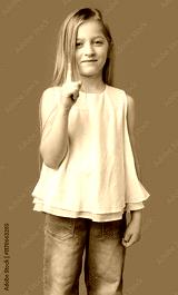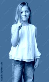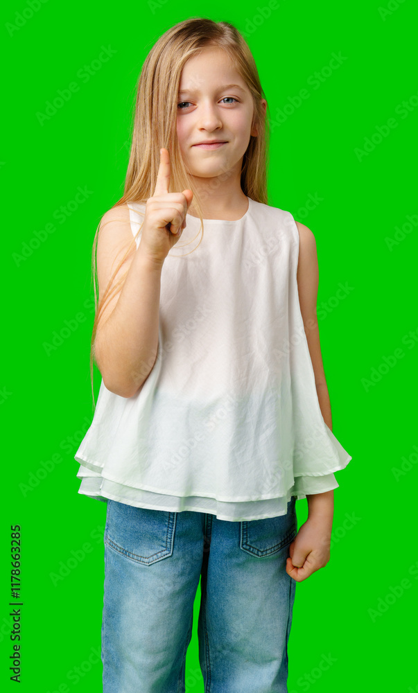 Young girl with long hair pointing upwards, showcasing her idea against a bright green background