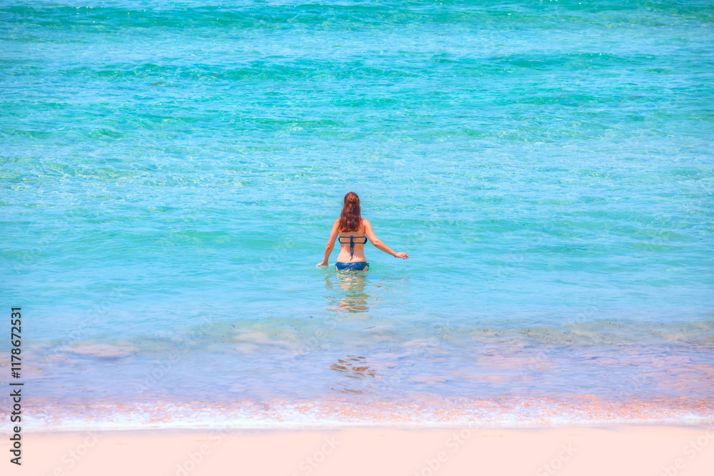 Young happy and playful red hair woman in blue bikini swimming on the turquoise sea playing with waves enjoying Summer holidays - Bali, indonesia