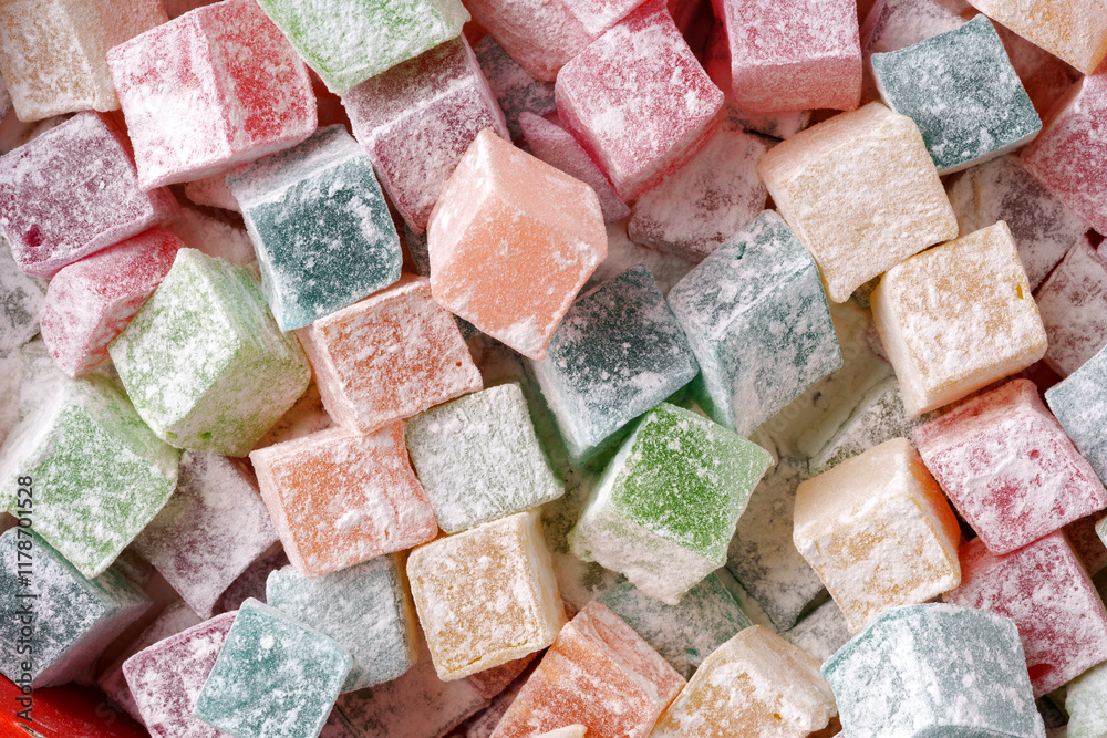 Colorful Turkish delight pieces arranged in a festive display for a cultural celebration or gathering