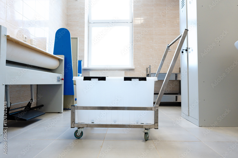 Clean and modern workspace featuring a rolling cart in a well-lit room designed for efficient operations