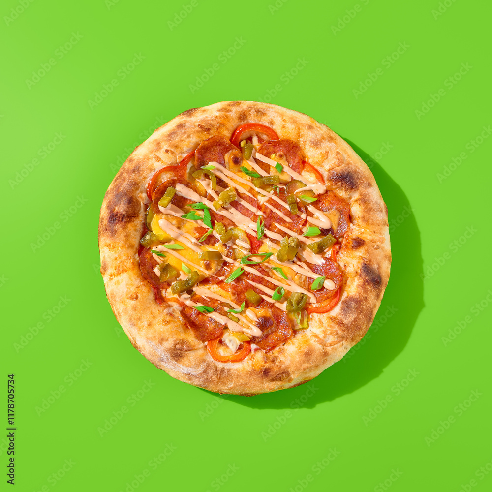 American pizza with thick crust, salami sausage, pepperoni, and spicy jalapeno peppers on a vibrant green background with hard shadows in a minimalist style. Pizza, top view. Takeaway, minimalism
