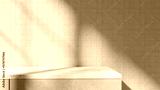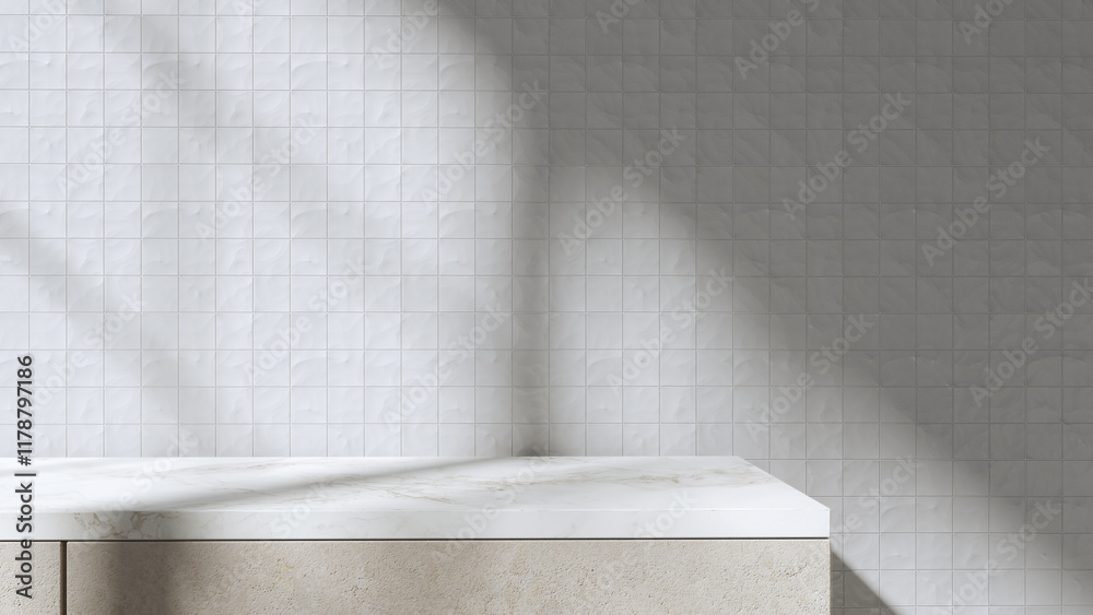 Empty marble clean countertop for presenting products, dishes and food items. A wall of ceramic tiles illuminated by soft morning light. The shadow of the window cast on the wall. Background, kitchen.