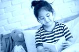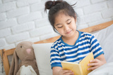 Happy Asian girl reading story book on the bed
