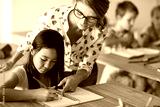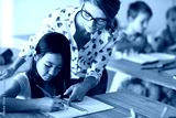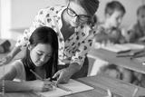 Teacher helping girl in homework