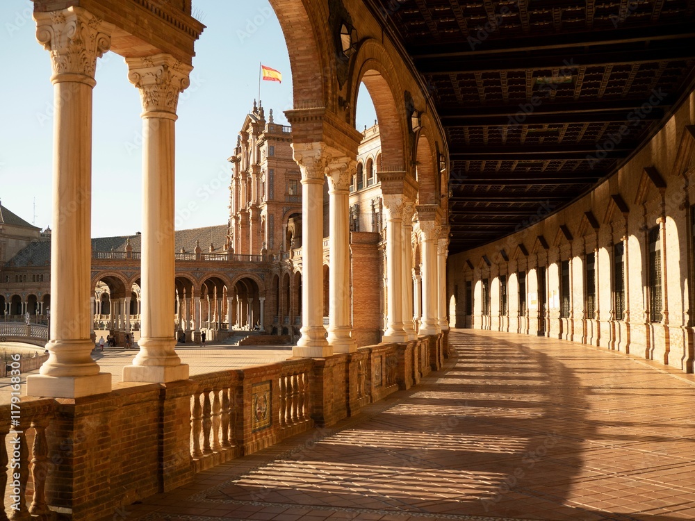 Sunlit arches and columns of Plaza de Espana, Seville, Spain