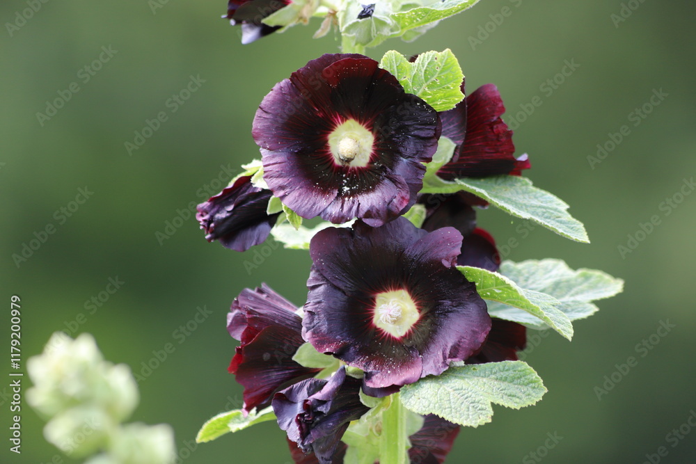 Alcea rosea known as black hollyhock in garden. Close up.