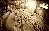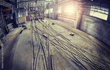 Vintage toned fisheye lens picture of abandoned industrial hall interior with trolley tracks.