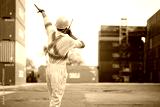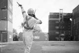 back view worker or engineer using walkie talkie and showing gesture to crane car in containers warehouse storage