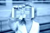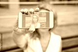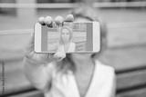Caucasian female adult taking self-portrait with smartphone, blurred background, cellphone photography focus, woman holding device.
