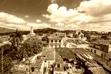 Trinidad historic city centre aerial view including Iglesia y Convento de San Francisco Church, from Palacio de Cantero, Trinidad, Cuba. Historic Trinidad Centre is a World Heritage Site.
