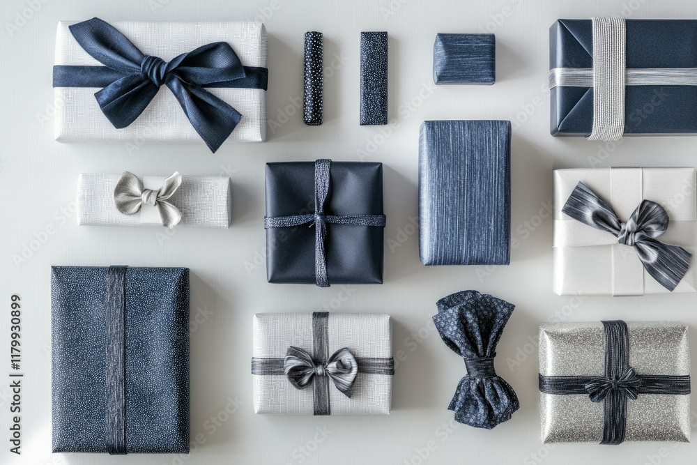 Elegantly wrapped gifts in shades of silver and navy blue, showcasing various ribbon styles and patterns.