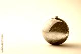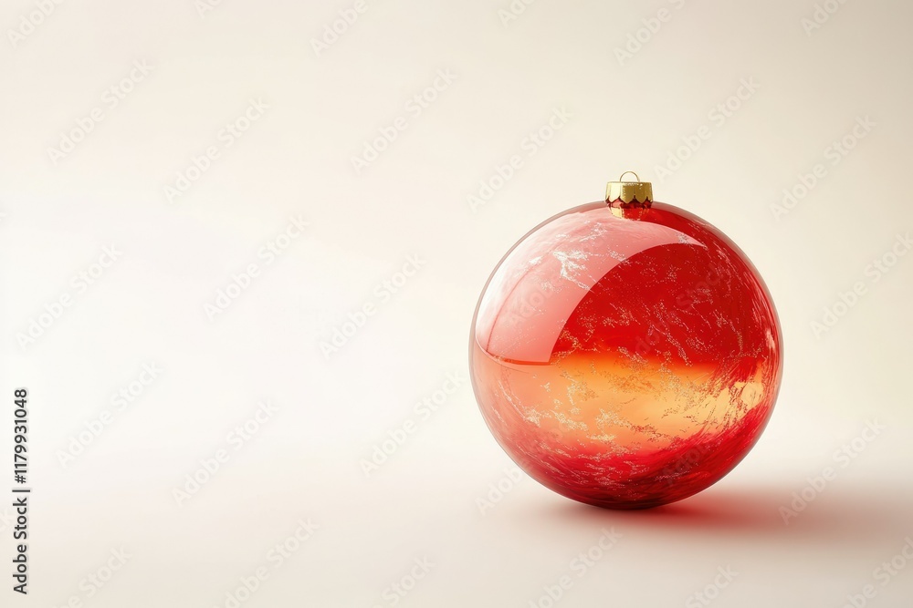 A single red glass Christmas ornament with gold accents rests on a minimalist white background.