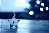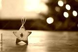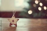 Rustic wooden star ornament rests on a wooden table, with a blurred Christmas tree in the background.