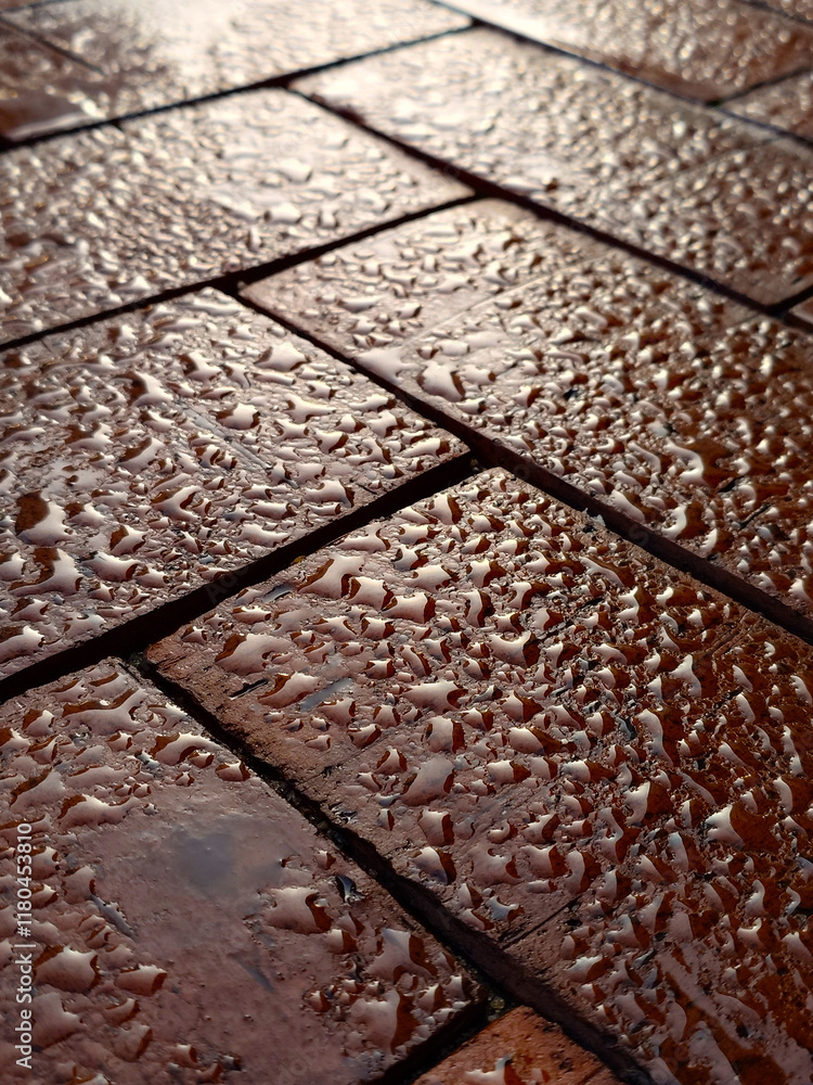 Wet brick pavement with water droplets, highlighting the texture, pattern, and glossy.