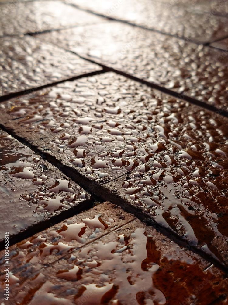 Wet brick pavement with water droplets, highlighting the texture, pattern, and glossy.
