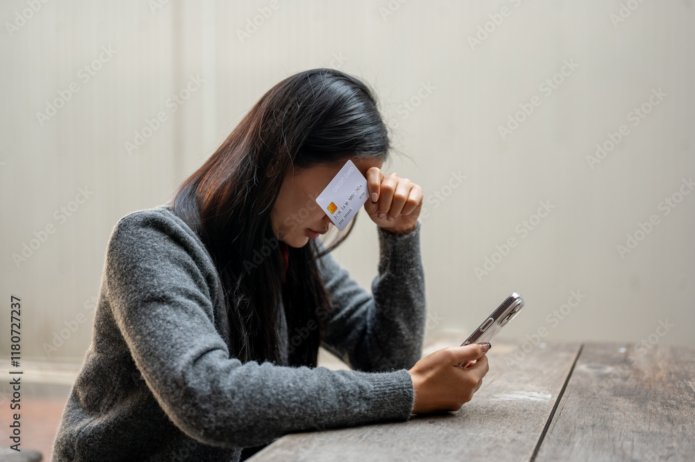 A woman struggling with her finances is holding a credit card and looking hopelessly at her phone.