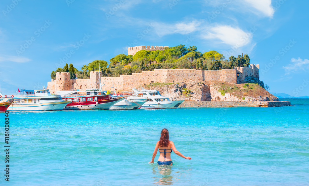 Young happy and playful red hair woman in blue bikini swimming on the turquoise sea playing with waves enjoying summer holidays Pigeon Island with a "Pirate castle" Kusadasi harbor - Aegean coast