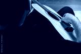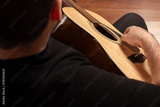 Man Playing Acoustic Guitar Top View, guitarist in indoor setting with concentration, practicing classic melodies on wood instrument.