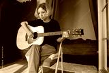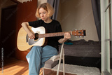 Woman playing acoustic guitar at home, performer learning fretboard techniques, classic music education in progress.