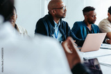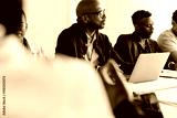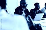 Professional men in a business meeting in a boardroom setting with laptops and documents
