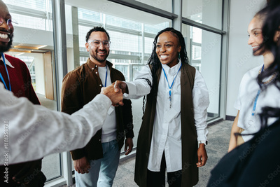 Young businesswoman shaking hands in the office with colleagues around