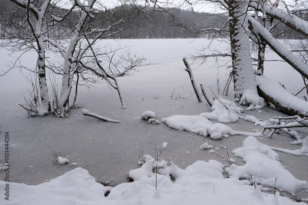 Snowy trees by Lubygosc lake in winter scenery. Nature Reserve Lubygosc, Kashubian Landscape Park, Mirachowskie Forests, Pomerania, Poland.