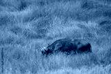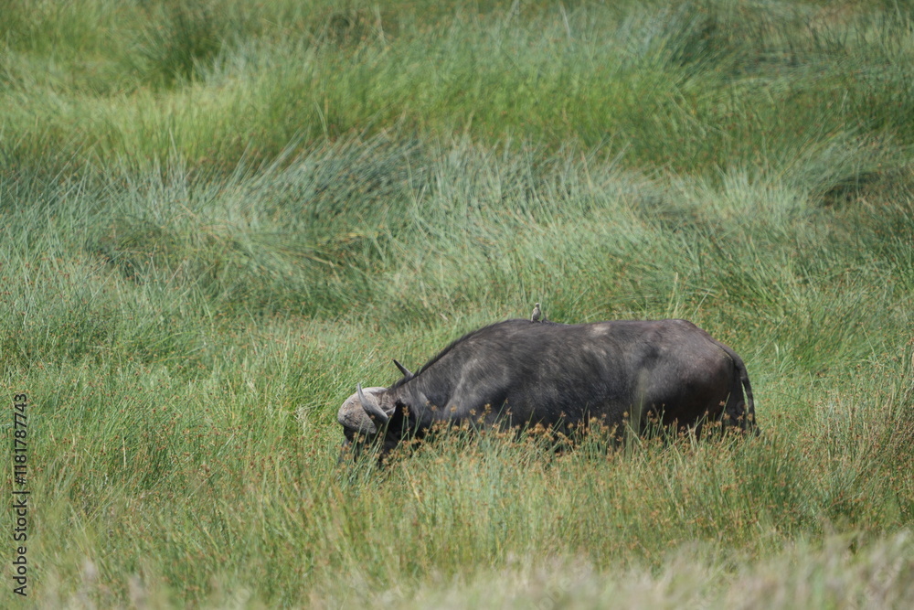 lone african buffalo walking through grass in the serengeti national park safari, wildlife