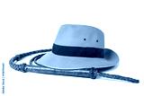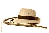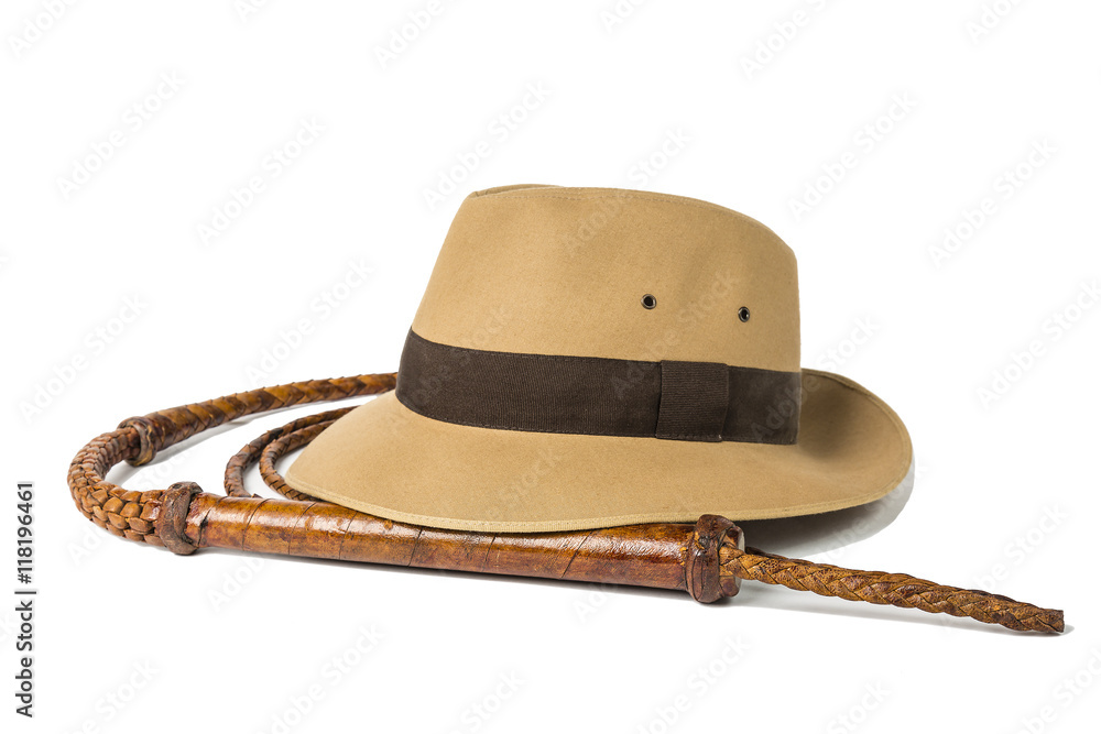 Adventure concept. Fedora hat and bullwhip isolated on white background