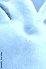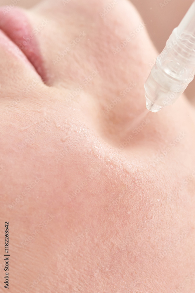 Close up of skincare procedure on female caucasian adult face with derma roller.