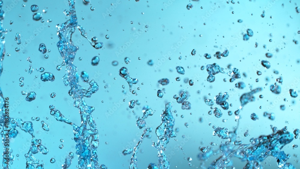 Abstract Splash of Water on a Blue Background. Drops Isolated Flying in the Air.
