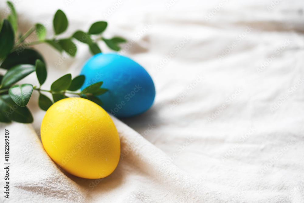 Easter background. Blue and yellow Easter eggs decorated with green twig on white fabric surface, close-up, copy space