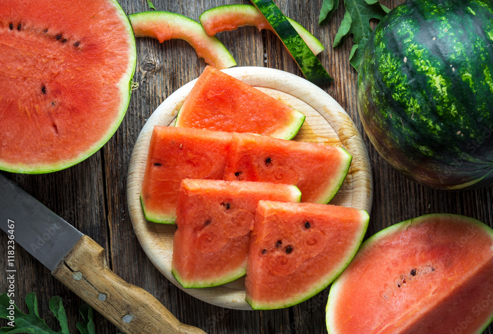 Fresh sliced watermelon on wooden background