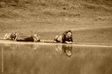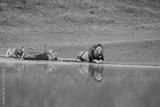 male lion with two femal lions (pride) laying at a reflective water pool in the Ngorongoro crater in Tanzania