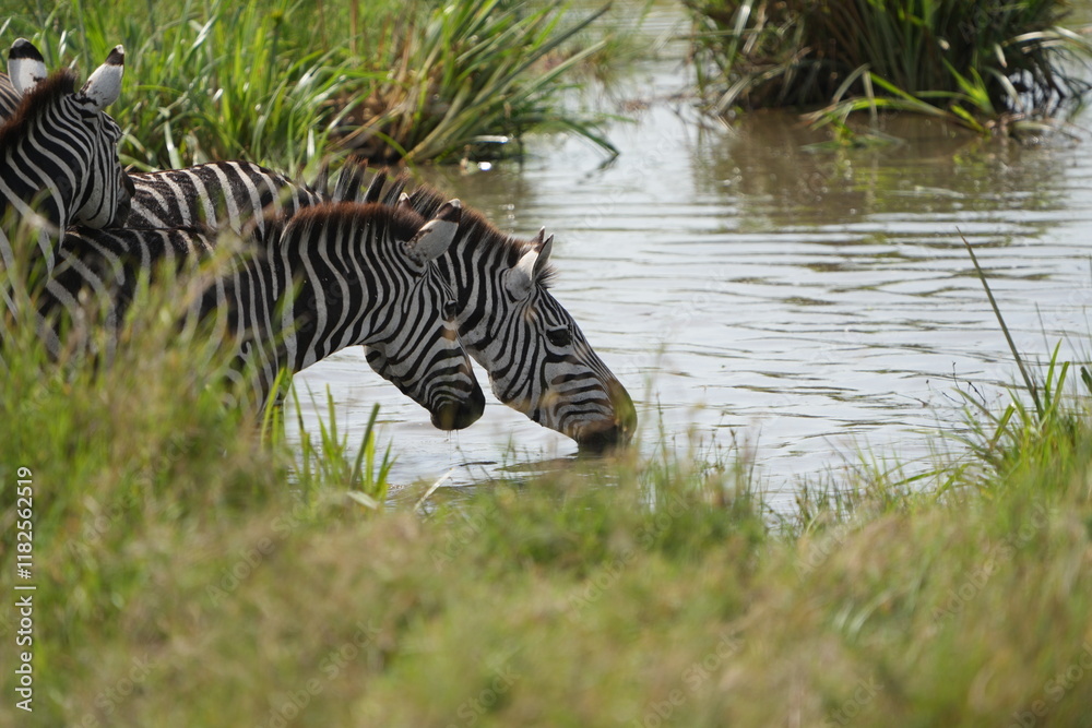 herd of zebras drinking water in the serengeti national park tanzania