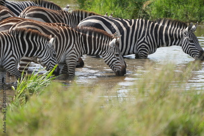 Zebras at the Waterhole – Striped Serenity drinking water with the herd on the African Plains