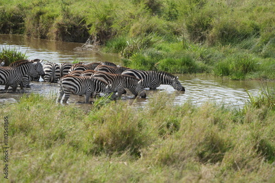 Zebras at the Waterhole – Striped Serenity drinking water with the herd on the African Plains