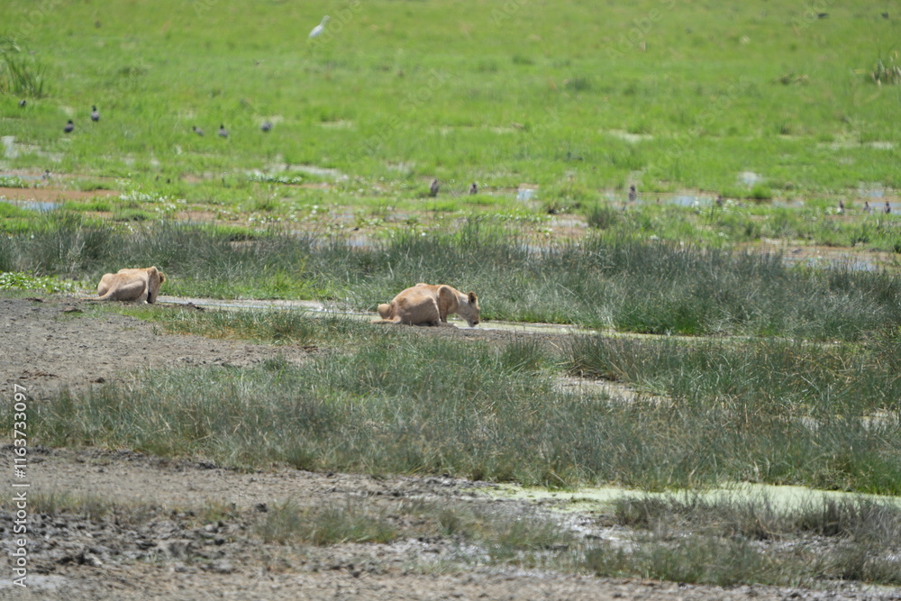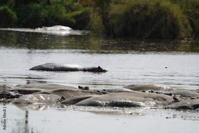 Hippos laying and chilling in the hippo pool in the serengeti national park in tanzania