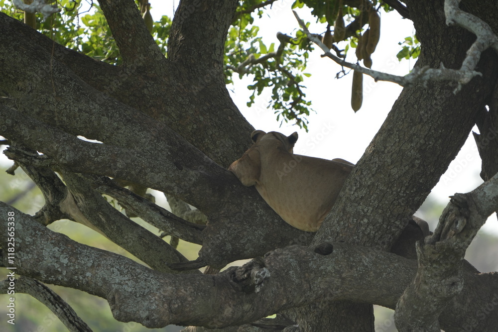lioness laying in a tree of the serengeti national park in tanzania, partially backlit