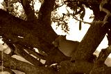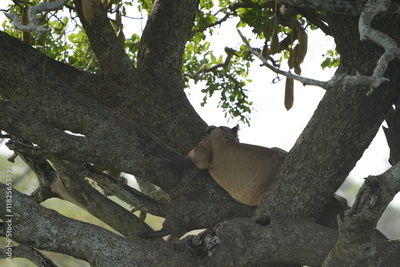 lioness laying in a tree of the serengeti national park in tanzania, partially backlit