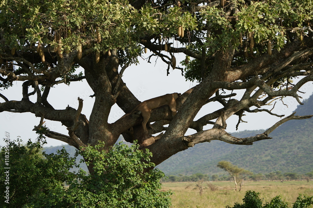 lioness chilling and laying in the tree in the serengeti national park tanzania, relaxed lion female