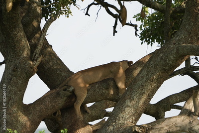 lioness chilling and laying in the tree in the serengeti national park tanzania, relaxed lion female