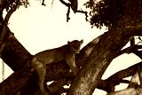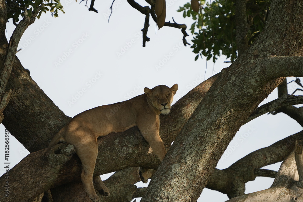 lioness chilling and laying in the tree in the serengeti national park tanzania, relaxed lion female