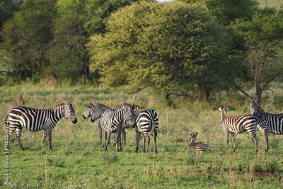 herd of cute zebras standing in the middle of the plains of the serengeti, including baby zebra