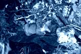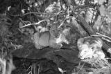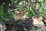 pair of baby lions (lion cubs) hiding under foliage and sitting on a rock, tranquil cute background